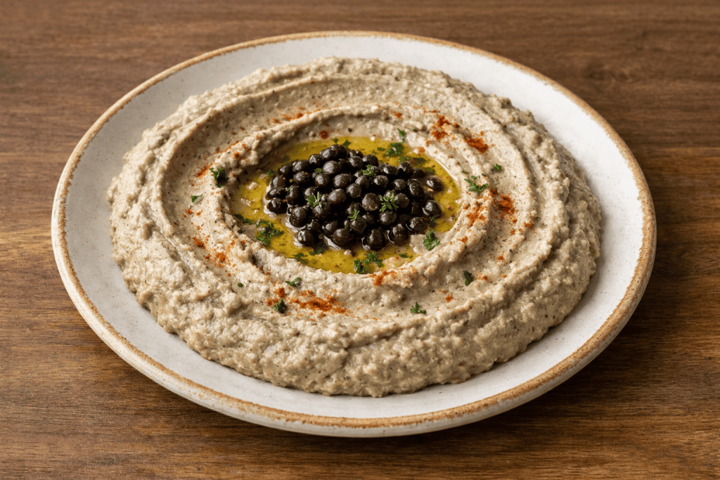 Un houmous original fait avec des lentilles noires. Plus de protéines et une belle couleur.