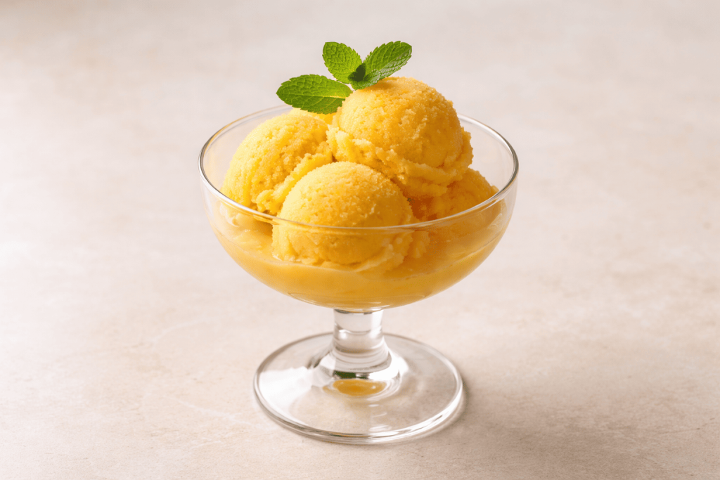 Un sorbet onctueux à la mangue sans sorbetière. Juste du fruit congelé mixé, frais et naturellement sucré.